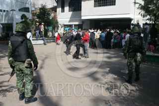 AMECAMECA, ESTADO DE MÉXICO, 27NOVIEMBRE2009.- En medio de un dispositivo de seguridad, elementos del ejercito mexicano, agentes ministeriales y policías estatales, trasladaron de la suprocuraduria de justicia de Amecameca a dos presuntos secuestradores que detuvieron habitantes de Ecatzingo. Al rededor del medio dia los pobladores acudieron al centro de justicia para pedir que sean remitidos y exigir más seguridad en la comunidad. FOTO: SAÚL LÓPEZ/CUARTOSCURO.COM