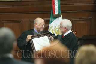MÉXICO, D.F., 30NOVIEMBRE2009.- Guillermo Ortiz Ministro Presidente de la Suprema Corte de Justica entregó un reconocimiento al Ministro Genaro Góngora Pimentel al término de la sesión solemne que se efectuo esta mañana con motivo de la conclusión de su mandato. FOTO: CUARTOSCURO.COM
