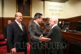 MÉXICO, D.F., 30NOVIEMBRE2009.- El Ministro Gerardo Gongora Pimentel al término de la sesión solemne que se efectuo esta mañana con motivo de la conclusión de su mandato, se despide de Carlos Navarrete Ruiz Presidente de la Mesa Directiva del Senado de la República. FOTO: CUARTOSCURO.COM