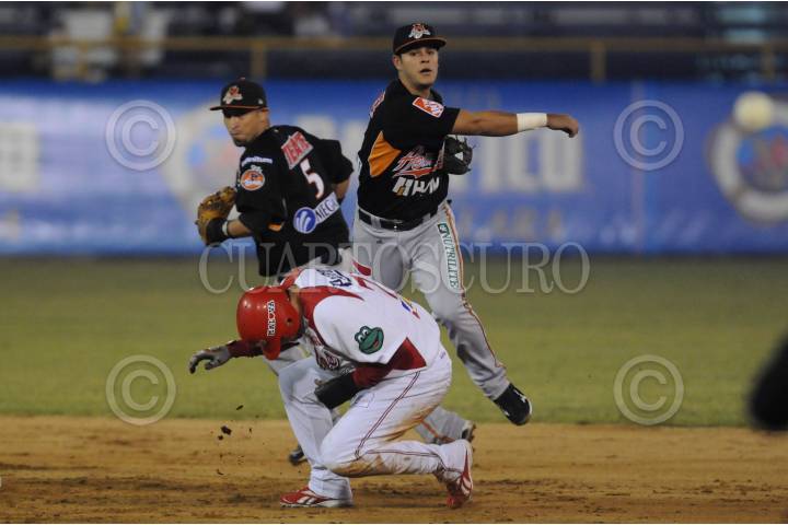 MAZATLAN, SINALOA, 01DICIEMBRE2009.- Walter Ibarra, de los Naranjeros de Hermosillo, durante el out a Ruben Rivera de los Venados de Mazatlan, durante el encuentro correspondiente a la segunda vuelta de la Liga Mexicana del Pacífico entre los Venados de Mazatlan y los Naranjeros de Hermosillo en el estadio Teodoro Mariscal. FOTO: JORGE OSUNA/CUARTOSCURO.COM