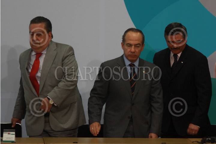 MÉXICO, D.F., 02DICIEMBRE2009.- Felipe Calderon Hinojosa Presidente de México asu salida del salon Adolfo Lopez Mateos de la residencia oficial de los Pinos, donde el mandatario mexicano realizó la clausura de la mesa redonda "La democracia de una encrucijada : el reto del financiamiento ilicito de la Politica" FOTO: SÁSHENKA GUTIÉRREZ/ CUARTOSCURO.COM