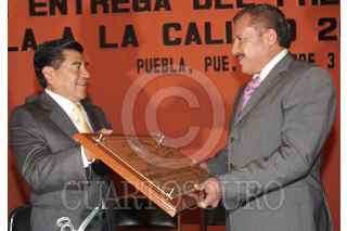 PUEBLA, PUEBLA, 04DICIEMBRE2009.- Enrique Agüera Ibáñez, Rector de la Benemérita Universidad Autónoma de Puebla recibió del gobernador del estado Lic. Mario Marín Torres, un reconocimiento y emblema por haber obtenido el “Premio Estatal Puebla a la Calidad2009”. FOTO:FRANCO/CUARTOSCURO.COM