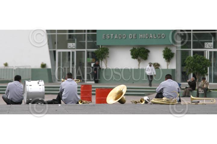 PACHUCA, HIDALGO, 04DICIEMBRE2009.- Un grupo de músicos esperan sentados frente al Palacio de gobierno estatal, en la plaza del centro de esta ciudad, que los contraten. FOTO: MISAEL VALTIERRA/CUARTOSCURO.COM