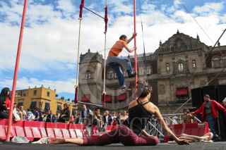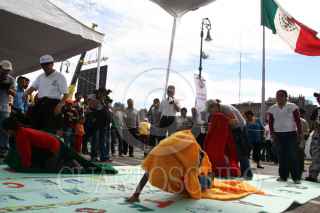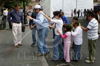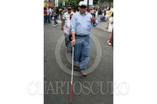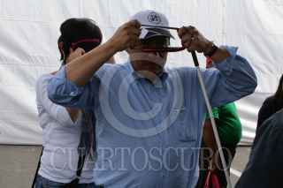 MÉXICO D.F., 06DICIEMBRE2009.- Luis Gonzalez Plascencia, presidente de la Comisión de Derechos Humanos camina con un grupo de personas cubiertas de los ojos durante una demostración para conocer más sobre como viven diariamente en la ciudad los invidentes durante la Octava Feria de los Derechos Humanos que se realiza a un costado del Zócalo y en donde tambien se realizan diversas actividades para para niños, jóvenes y adultos. FOTO: RODOLFO ANGULO/CUARTOSCURO.COM
