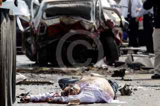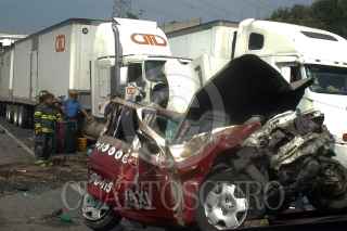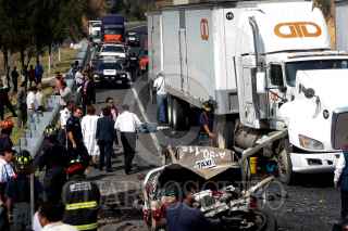 MÉXICO, D.F., 07DICIEMBRE2009.- Dos personas de sexo masculino pierden la vida al ser impactados en los autos en lo que viajaban, un auto Pointer y un auto Ford Focus donde viajaban elementos de la policía Ministerial del Estado de México por dos camiones tipo trailer que conducía en exceso de velocidad en el Kilómetro 26 mas 500 de la Autopista Chamapa Toluca dos personas más lesionadas fueron trasladadas a hospitales particulares por unidades de Cruz Roja de Naucalpan. FOTO: LUIS CARBAYO/CUARTOSCURO.COM