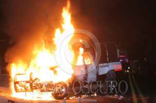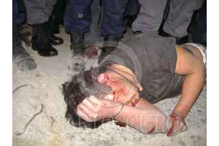 NAUCALPAN, ESTADO DE MÉXICO, 10DICIEMBRE2009.- Más de 400 pobladores de San Francisco Chimalpa intentaron linchar a Julio César Luna Robles de 22 años quien atacó sexualmente a una jovencita de 13 años de edad. En el rescate del detenido participaron más de 300 policías, sin embargo los lugareños incendiaron una patrulla de la policía municipal en el km 18 de la carretera Naucalpan-Toluca. FOTO: LUZ ACEVEDO/CUARTOSCURO.COM