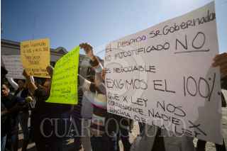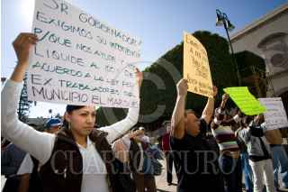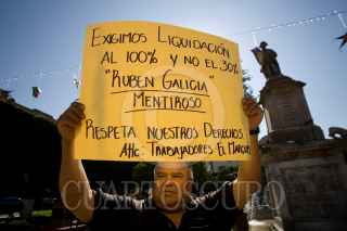 QUERÉTARO, QUERÉTARO, 10DICIEMBRE2009.- Un grupo de manifestantes protestan a las afueras del Palacio de Gobierno, exigiendo la intervención del Gobernador para su liquidación al 100 por ciento. Lanzando consignas contra el actual alcalde Rubén Galicia quién presuntamente los despidió sin las liquidaciones de ley. FOTO: DEMIAN CHÁVEZ/CUARTOSCURO.COM