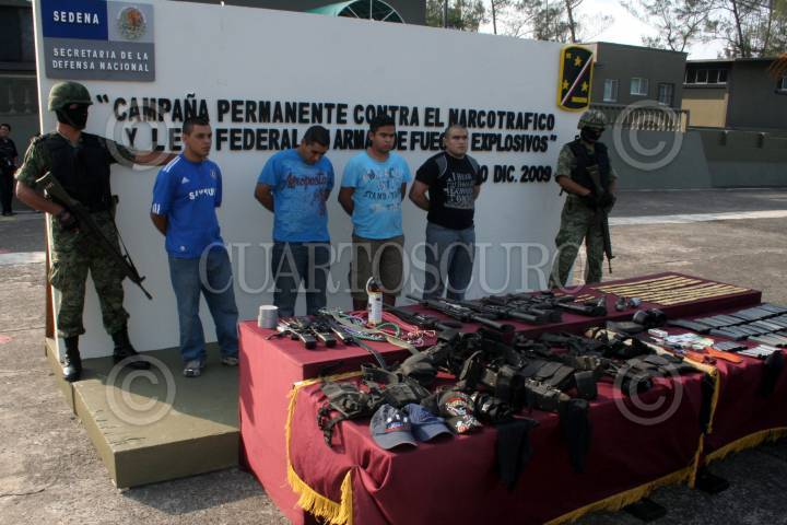 VERACRUZ, VERACRUZ. 10DICIEMBRE2009.- Esta tarde fueron presentados cuatro personas en las instalaciones la sexta región militar con sede en esta ciudad. Se trata de David Gustavo de Jesús Gutiérrez Bobadilla, Sergio Armando Pérez Hernández, Carlos Oswaldo Guzmán Zamudio y Luís Enrique Estudillo Montoso, a quienes les aseguraron cinco armas largas, un arma corta, tres granadas de fragmentación, 51 cargadores para diferentes armas, 965 cartuchos de diversos calibres y equipo diverso. Dicha detención fue resultado de una denuncia ciudadana y se llevo a cabo sobre la avenida central esquina Sur, entre Norte 4 y Sur 3, del infonavit casas TAMSA del municipio conurbado de Boca del Río, por donde circulaba una camioneta con cuatro sujetos armados, quienes atraves de recorridos fueron ubicados marcándoles el alto; sin embargo los ocupantes trataron de darse a la fuga impactando su unidad contra un vehículo militar lo que provoco detuvieran su marcha descendiendo los cuatro ocupantes armados, quienes al ver la superioridad de los militares optaron por entregar sus armas, los detenidos fueron puestos a disposición del Ministerio Público de la Federación. FOTO: JOSÉ CANDELARIO/CUARTOSCURO.COM