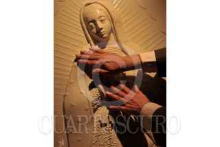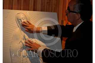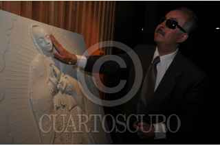 MÉXICO, D.F., 10DICIEMBRE2009.- Ahora, invidentes pueden "imaginar" a la Virgen de Guadalupe a detalle, con la escultura en bajorrelieve que fue realizada en Italia y traída a México con motivo de las fiestas de Guadalupe en donde esta expuesta para que los invidentes puedan tocar e imaginen la imagen de la Virgen. El proyecto a cargo del Sr. Jorge Pulido (Invidente) quien nos muestra la escultura. FOTO: LUIS CARBAYO/CUARTOSCURO.COM