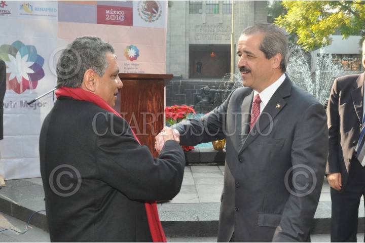 MÉXICO, D.F., 11DICIEMBRE2009.- Fidel Herrera Beltran, Gobernador del estado de Veracruz, saluda a José Angel Cordova Villalobos, Secretario de Salud, durante la puesta en marcha del programa de brigadas de prevención 2009, de la Red Nacional para la Prevención de la Discapacidad (Renapred). FOTO: EDUARDO MORALES/CUARTOSCURO.COM