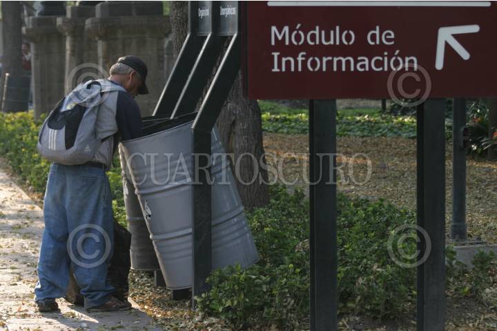 MÉXICO D.F.,12DICIEMBRE2009.- Un señor busca en botes de basura colocados en el Bosque de Chapultepec, botellas de plástico y aluminio para reciclar. En México existen 54.8 millones de pobres, 51% de la población. La crisis de este año, que interrumpió un lustro de crecimiento económico en Latinoamérica y el Caribe, provocó un aumento de 8.3 millones de pobres en la región, de los cuales la mitad vive en México. FOTO: MISAEL VALTIERRA/CUARTOSCURO.COM
