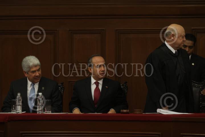 MÉXICO, D.F. 15DICIEMBRE2009.- Felipe Calderon Hinojosa Presidente de México llega acompañado por los ministrosJosé de Jesús Gaudiño y Sergio Vals Hernández a su salida de la suprema corte de justicia donde esta tarde Guillermo Ortiz Mayagoiria rindió su informe anual de labores FOTO: SÁSHENKA GUTIÉRREZ/CUARTOSCURO.COM