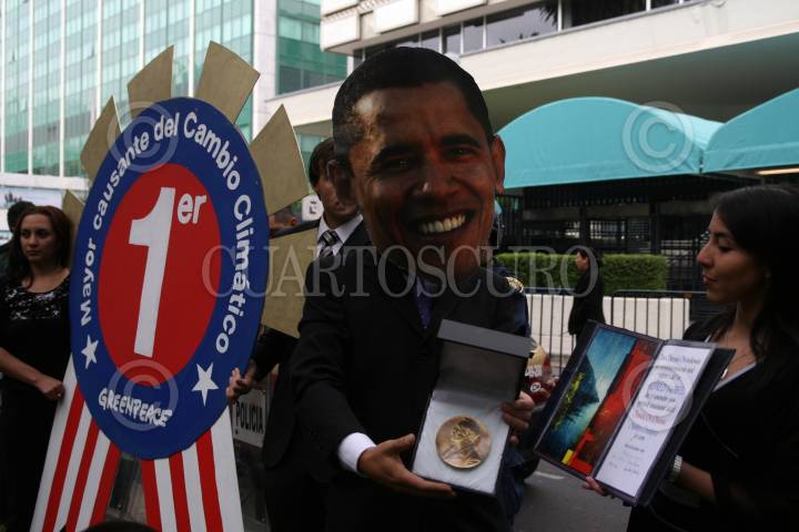 MÉXICO, D.F., 16DICIEMBRE2009.- Integrantes de la organización social Greenpeace se manifiestan, afuera de la embajada de E.U. En donde un integrante uso una mascara con el rostro del presidente Barack Obama, emula recibir el premio por ser el principal promotor del cambio climático y dirigir al país que es el mayor emisor histórico de gases de efecto invernadero. FOTO: MARCO POLO GUZMÁN HERNÁNDEZ/CUARTOSCURO.COM