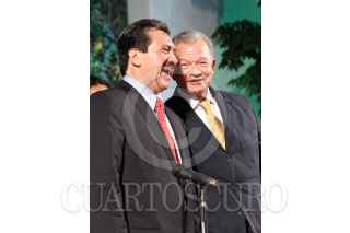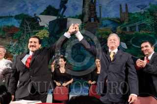 VILLAHERMOSA, TABASCO, 16DICIEMBRE2009.- Evaristo Hernández Cruz, durante su tercer y último informe de gobierno municipal de Centro, acompañado de Andres Granier Melo, gobernador del estado, el cual se llevo a cabo en Palacio Municipal. En este informe de actividad estuvo presente como invitado especial el gobernador Andrés Granier Melo quien le alzo la mano en señal de triunfo. FOTO: ESPECIAL/CUARTOSCURO.COM