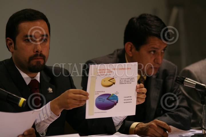 MÉXICO D.F., 17DICIEMBRE2009.- Los asambleístas del PRD; Fernando Cuellar Reyes, Alejandro Sánchez Camacho, Víctor Hugo Ramón Guerra y el director del Sistema de Transporte Colectivo Metro, Francisco Bojórquez Hernández en el comunicado que dan sobre la solución al alza del pasaje que se dio en el salón Benito Juarez. FOTO: MARCO POLO GUZMÁN HERNÁNDEZ/CUARTOSCURO.COM