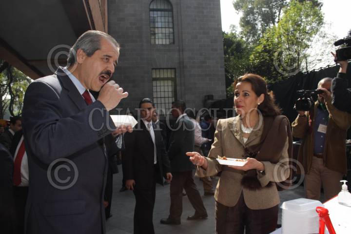 MÉXICO, D.F., 21DICIEMBRE2009.- Al termino de que el secretario de Salud, José Ángel Córdova Villalobos, presentara esta mañana en el patio central de la secretaria su informe de avance de actividades 2009, convivio acompañado por su esposa Gabriela Gallardo con los asistentes en una verbena popular. FOTO: SÁSHENKA GUTIÉRREZ/CUARTOSCURO.COM