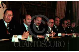 El Presidente Carlos Salinas de Gortari, durante la conformacion del Plan Nacional de Desarrollo 1988-1994, a su lado Fernado Gutierrez Barrios, Fernado Solana. Guillermo Jimenez Morales. 31MAY1989 Foto: Tomas Martinez/Archivo/Cuartoscuro