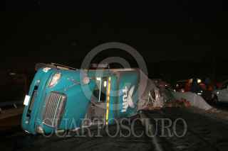 TLALNEPANTLA, ESTADO DE MÉXICO, 28DICIEMBRE2009.- Esta madrugada se registro una volcadura de dos trailers, desquiciaron el tránsito vehicular sobre la autopista México-Querétaro por mas de seis horas. Uno de los pesados vehículos volcó sobre la autopista en su incorporación hacia la avenida del Durazno, el vehículo de carga transportaba 18 toneladas de huevo. El otro vehículo recostó sobre su lado izquierdo sobre la avenida Jesús Reyes Heroles frente al panteón Jardínes del Recuerdo con mas de 30 toneladas de botellas de tequila. FOTO: LUZ ACEVEDO/CUARTOSCURO.COM