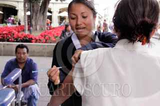 OAXACA, OAXACA, 28DICIEMBRE2009.- A fin de prevenir las enfermedades respiratorias debido a las bajas temperaturas, la Secretaria de Salud en Coordinación con el Instituto Mexicano del Seguro Social ha implementado la campaña de vacunación contra la Influenza Estacional, vacunando a un promedio de 150 personas por día en lugares como parques, plazas públicas y calles, esto tan solo en el centro de la ciudad. FOTO: MAX NÚÑEZ /CUARTOSCURO.COM