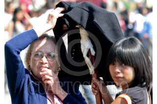 MÉXICO, D.F., 01ENERO2010.- Una familia cubre un cristo del sol este medio día en el cual cientos de fieles acuden a la Basílica de Guadalupe para dar gracias por el año que termino y para recibir las buenas bendiciones en este nuevo año 2010 que comienza. FOTO: RODOLFO ANGULO/CUARTOSCURO.COM
