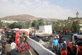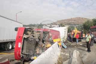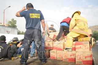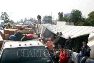TLALNEPANTLA, ESTADO DE MÉXICO, 06ENERO2010.- Un trailer con más de 30 toneladas de aceite comestible volcó esta mañana sobre la Vía Jesús Reyes Heroles, frente al panteón Jardines del Recuerdo, ocasionando un severo congestionamiento vehicular por mas de tres hora. FOTO: LUIS CARBAYO/CUARTOSCURO.COM