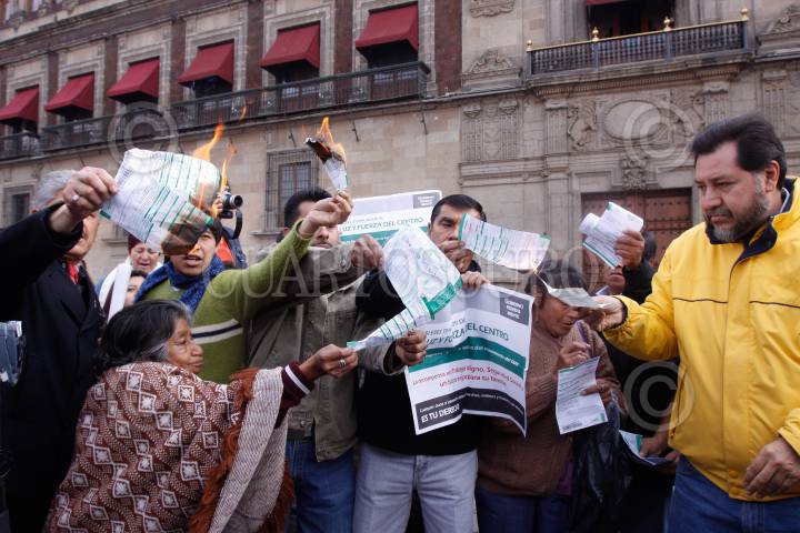 MÉXICO, D.F., 06ENERO2010.- Ciudadanos y simpatizantes del Sindicato Mexicano de Electricistas quemaron los recibos de consumo de luz que ha emitido la Comisión Federal de Electricidad en sustitución de los de la Compañía de Luz y Fuerza del Centro. Hace unos meses el gobierno federal emitió el decreto de la desaparición de esta empresa paraestatal y anunció que la encargada de proveer la energía en a zona centro sería CFE como lo hace en todo el país. Ante esto el sindicato ha hecho un llamado para que no se pague el servicio ya que ellos señalan que no hay ningún contrato con la empresa llamada de "clase mundial" que obligue a este pago. FOTO: MOISÉS PABLO/CUARTOSCURO.COM