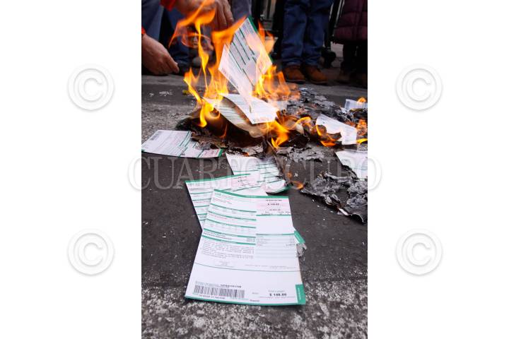 MÉXICO, D.F., 06ENERO2010.- Ciudadanos y simpatizantes del Sindicato Mexicano de Electricistas quemaron los recibos de consumo de luz que ha emitido la Comisión Federal de Electricidad en sustitución de los de la Compañía de Luz y Fuerza del Centro. Hace unos meses el gobierno federal emitió el decreto de la desaparición de esta empresa paraestatal y anunció que la encargada de proveer la energía en a zona centro sería CFE como lo hace en todo el país. Ante esto el sindicato ha hecho un llamado para que no se pague el servicio ya que ellos señalan que no hay ningún contrato con la empresa llamada de "clase mundial" que obligue a este pago. FOTO: MOISÉS PABLO/CUARTOSCURO.COM