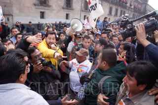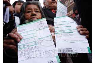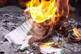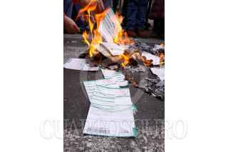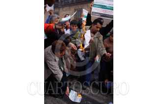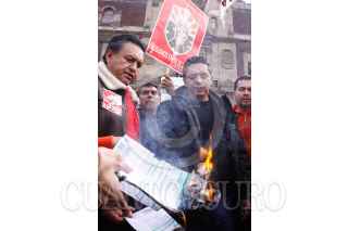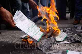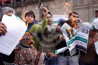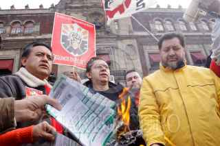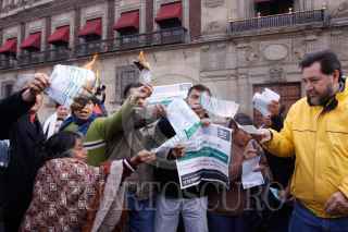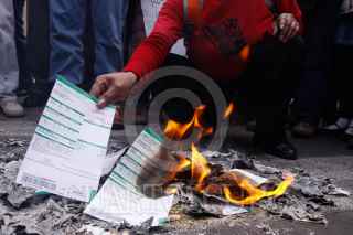 MÉXICO, D.F., 06ENERO2010.- Ciudadanos y simpatizantes del Sindicato Mexicano de Electricistas quemaron los recibos de consumo de luz que ha emitido la Comisión Federal de Electricidad en sustitución de los de la Compañía de Luz y Fuerza del Centro. Hace unos meses el gobierno federal emitió el decreto de la desaparición de esta empresa paraestatal y anunció que la encargada de proveer la energía en a zona centro sería CFE como lo hace en todo el país. Ante esto el sindicato ha hecho un llamado para que no se pague el servicio ya que ellos señalan que no hay ningún contrato con la empresa llamada de "clase mundial" que obligue a este pago. FOTO: MOISÉS PABLO/CUARTOSCURO.COM