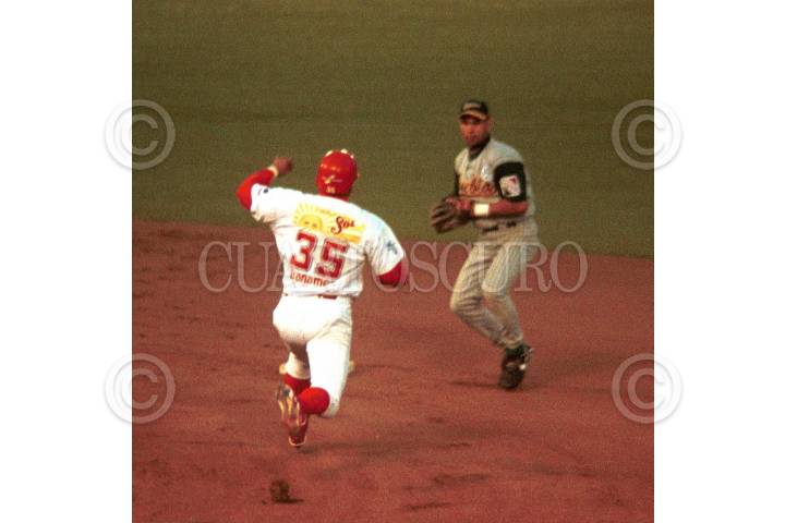 En una de las jugadas entre los Diablos Rojos de México y los Pericos de Puebla, Ramón Esquer regresa a primera base ante la reacción del primera base. Hasta la sexta entrada, los Pericos ganaban 3-0 carreras en el Foro Sol. FOTO: David Bolaños/CUARTOSCURO.COM