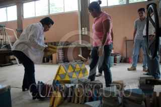 VILLAHERMOSA, TABASCO, 15ENERO2010.- La maestra en Ingeniería y Protección Ambiental e ingeniero Civil, Noemí Méndez de los Santos presento esta tarde en el taller de investigaciones científicas del Instituto Tecnológico de Villahermosa (ITVH) una nueva manera de hacer blocs con escombro lo patento con la forma perfecta de triángulo. El equipo de trabajo conformado por los también investigadores en ingenieria civil e industrial; Carlos Rodriguez Jimenez, Héctor Cruz Goméz, José Ramón Laines Canepa y estudiantes informaron que ellos están dispuestos a viajar hacia Haíti para ayudar a reconstruir la devastada isla por el terremoto. FOTO: MARCO POLO GUZMÁN HERNÁNDEZ/CUARTOSCURO.COM