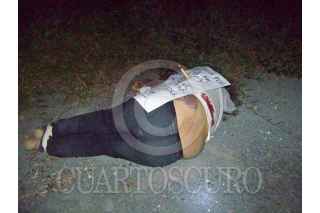 CÁRDENAS, TABASCO, 16ENERO2010.- Ejecutado con varios impactos de bala de alto calibre, con el rostro vendado, pies y manos atados es a como las autoridades policíacas municipales encontraron a un desconocido en los alrededores del ejido Cárdenas. De la misma manera el cuerpo sin vida tenia un narcomensaje clavado con un pica hielo. FOTO: MARCO POLO GUZMÁN HERNÁNDEZ/CUARTOSCURO.COM