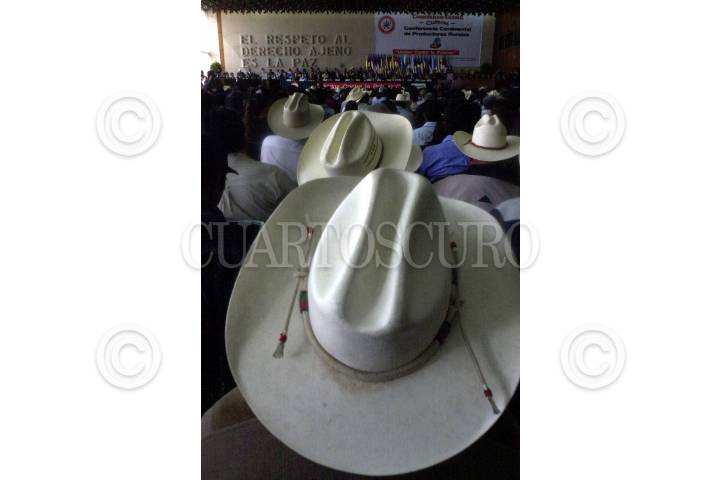Campesinos escuchan la "Conferencia Continental de Productores Rurales" en la Secretaria de Relaciones Exteriores. Ahí, el canciller Derbez consideró como una "idea jalada de los cabellos" la propuesta de los Rancheros estadounidenses para que los Cascos azules vigilen la frontera norte y evitar el paso de indocumentados. FOTO: Juan Pablo Zamora/CUARTOSCURO.COM