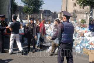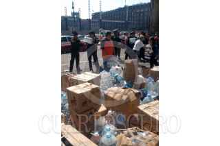 MÉXICO, D.F., 22ENERO2010.- Elementos de la Secretaria de Seguridad Publica del Distrito Federal descargan en el zócalo capitalino cuatro toneladas de agua embotellada que donaron para los damificados por el terremoto de Haiti. FOTO: LUIS CARBAYO/CUARTOSCURO.COM
