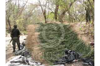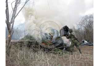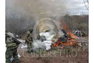 CULIACAN, SINALOA, 22ENERO2010.- Alrededor de 20 toneladas de marihuana fueron decomisadas e incineradas en las Inmediaciones de el Zapote de los Cazarez. La droga estaba en dos campamentos improvisados como a 700 metros de dsitancia uno del otro, en ellos había secaderos de la droga y en costales listas para ser prensadas, también se decomisaron varias prensas una camioneta ford lobo,u n rifle calibre 22 milimitros asi como 250 cartuchos útiles para rifle ak-47. En el lugar laboraban aproximadamente 20 personas logrando detener a una de ellas de nombre José Luis Covarruvias de 22 años de edad y es residente del estado de Hidalgo. FOTO: JUAN MADRIGAL/DEBATE DE CULIACAN/CUARTOSCURO.COM
