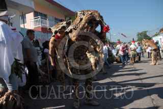 TENOSIQUE, TABASCO, 24ENERO2010.- La danza del "Cojo" realizó su primer representación por distintas calles y colonias de la cabecera municipal. Esta tradición milenaria inició hace más de mil quinientos años en donde el bien trata de combatir al mal; en su procesar los Pochos, Pochoveras y Tigrillos asuzan a los habitantes con disfraces y mascaras con lo que aprovechan para arrojar harina. FOTO: MARCO POLO GUZMÁN HERNÁNDEZ/CUARTOSCURO.COM