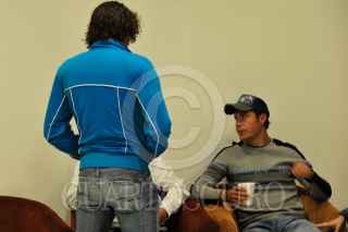 MÉXICO D.F., 25ENERO2010.- Cristian Riveros (izquierda), mediocampista del Cruz Azul y Dante López (derecha), delantero del club Pumas de la UNAM (ambos paraguayos), durante su estancia en el hospital Ángeles del Pedregal, al cual asistieron luego de conocer la noticia de que el atacante americanista Salvador Cabañas fue herido de bala cuando se encontraba en un conocido antro del sur de la ciudad de México. Cabañas fue intervenido quirurgicamente en este nosocomio. FOTO: LUIS CARBAYO/CUARTOSCURO.COM