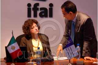 MÉXICO D.F., 27ENERO2010.- Jacqueline Peschard, Comisionada Presidenta del Instituto Federal de Acceso a la Información (IFAI), conversa con Ángel Trinidad Zaldivar, comisionado del mismo órgano durante la sesión publica que se llevo a cabo el día de hoy. FOTO: CUARTOSCURO.COM