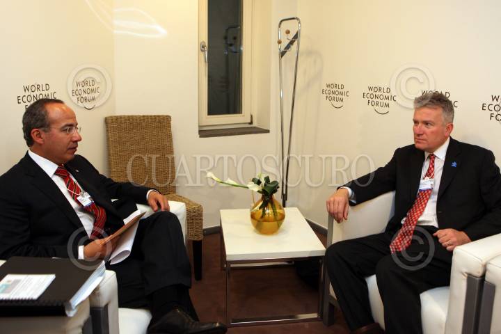 DAVOS, SUIZA, 28ENERO2010.- Felipe Calderón Hinojosa, Presidente de México, durante su reunión con José Luis Rodríguez Zapatero, Presidente de España, como parte del Foro Económico Mundial. Este se llevó acabo en la sala M18 del centro de congresos. FOTO: ALFREDO GUERRERO/CUARTOSCURO.COM