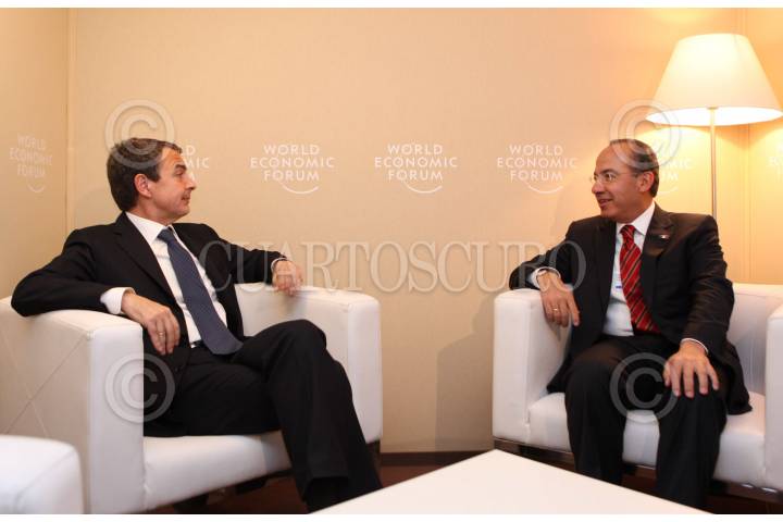 DAVOS, SUIZA, 28ENERO2010.- Felipe Calderón Hinojosa, Presidente de México, durante su reunión con José Luis Rodríguez Zapatero, Presidente de España, como parte del Foro Económico Mundial. Este se llevó acabo en la sala M18 del centro de congresos. FOTO: ALFREDO GUERRERO/CUARTOSCURO.COM