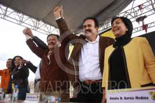 ZACATECAS, ZACATECAS 31ENERO2010.- Carlos Navarrete Presidente de la Mesa Directiva del Senado de la República levanta los brazos a Antonio Mejia Haro candidato como gobernador del estado de Zacatecas, durante su toma de protesta. FOTO: SÁSHENKA GUTIÉRREZ/CUARTOSCURO.COM