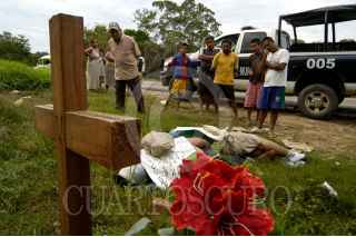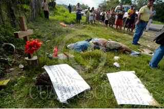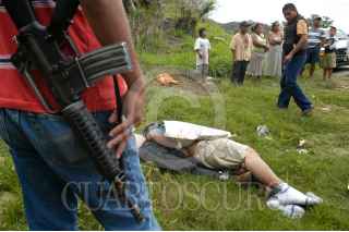 ACAPULCO, GUERRERO, 31ENERO2010.- En la mañana de hoy aparecieron dos cuerpos sin vida con señales de tortura, vendados con cinta adesiva y con el tiro de gracia en el kilometro 32 conocido como el Huapinol de la carretera México - Acapulco, con dos cartulinas con el mensaje: "Aquí en Guerrero y Morelos no cabes Sergio Villareal alias el Grande puto traicionero le lavaste el coco a Hector Beltran Leyva ahora vayance a la verga hijos de su puta madre los dos putos". FOTO: BERNANDINO HERNANDEZ/CUARTOSCURO.COM