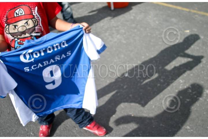 MÉXICO, D.F., 31ENERO2010.- Miles de aficionados se dan cita en las inmediaciones del estadio Azteca para poder acceder al partido entre las Aguilas del América contra los Indios de Ciudad Juárez. En la imagen, Un niño pone a la venta playeras del ariete americanista Salvador Cabañas. En días pasados, el futbolista paraguayo recibió un impacto de arma de fuego en la cabeza, lo que lo mantiene en grave estado de salud. FOTO: MISAEL VALTIERRA/CUARTOSCURO.COM