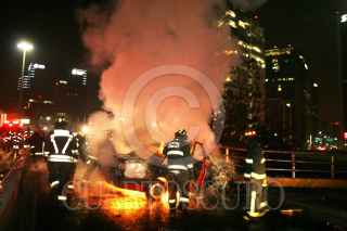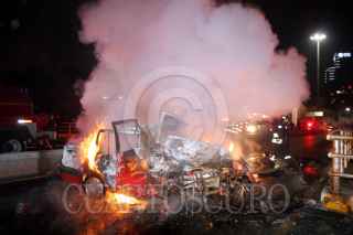 MÉXICO, D.F., 02FEBRERO2010.- Un muerto y un lesionado es el saldo de un choque de un coche color rojo con matrícula 633 MKV contra el muro de contención en Paseo de La Reforma y el anillo Periférico en la zona de Polanco. el automóvil se incendio.El oficial de policía del sector Polanco, Benjamín Neyra Hernández de 45 años resultó con quemaduras en el rostro después de rescatar a los tripulates del vehículo. FOTO: LUZ ACEVEDO/CUARTOSCURO.COM