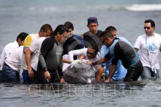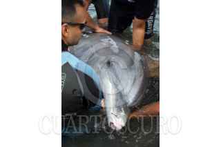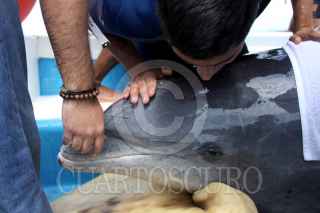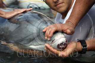 BOCA DEL RÍO, VERACRUZ., 03FEBRERO2010.- Un delfín hembra de la especie conocida como tonina y de aproximadamente 3 metros apareció varado en las playas de Boca del Río, muy cerca de la zona turística, al lugar llegó personal del Parque Arrecifal en conjunto con el Acuario de Veracruz, los cuales tomaron muestras de las condiciones en las que se encontraba este mamífero. FOTO: FÉLIX MÁRQUEZ/CUARTOSCURO.COM