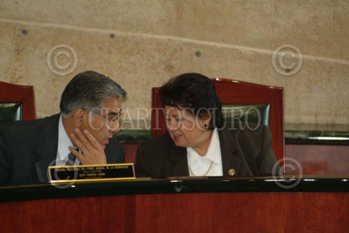 Los magistrados Eloy Fuentes Cerda y Alfonsina Berta Navarro Hidalgo conversan durante la sesión del Tribunal electoral del poder judicial. FOTO: Nelly Salas/CUARTOSCURO.COM