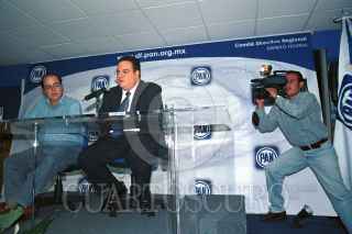 Fernando Aboitiz, delegado electo de la Miguel Hidalgo y Adrián Fernández, secretario general del PAN en funciones de presidente regional en sustitución de Luege Tamargo. Ambos ofrecieron un conferencia de prensa en su sede capitalina en torno a la controversia de el supuesto exceso en los gastos de campaña de Aboitiz Saro. FOTO: Moisés Pablo/CUARTOSCURO.COM