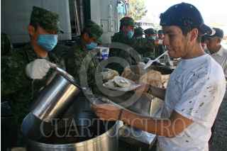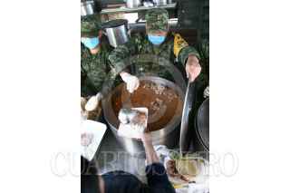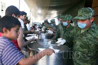 TUXPAN, MICHOACÀN, 05FEBRERO2010.- Elementos de la cocina movil de la Secretaria de la Defensa, dan de comer a miles de damnificados por el desbordamiento del rio Tuxpan. FOTO: SAÚL LÓPEZ ESCORCIA/CUARTOSCURO.COM