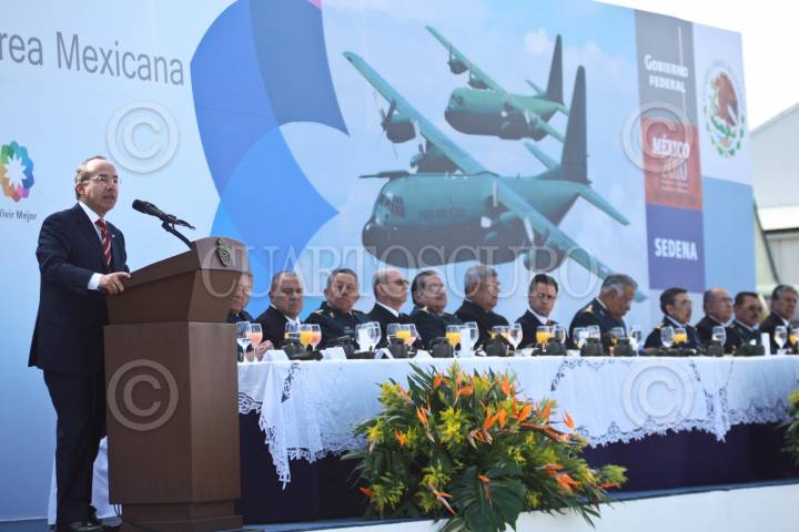 TECÁMAC, ESTADO DE MÉXICO, 10FEBRERO2010.- Felipe Calderón Hinojosa, Presidente de México, encabezó ceremonia conmemorativa del "XCV Aniversario de la Fuerza Aérea Mexicana", realizada en el campo militar número 37 Santa Lucía. FOTO: ALFREDO GUERRERO/CUARTOSCURO.COM