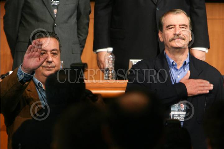 MÉXICO, D.F., 10FEBRERO2010.- Fernando Gómez Mont, actual Secretario de Gobernación, anuncio atraves de un comunicado su renuncia al Partido Acción Nacional, en el cual había militado toda su vida, su padre Felipe Gómez Mont fue fundador de este instituto político. Apenas el 06 de Diciembre del 2008 tomo protesta como consejero panista, en la imagen esta acompañado de Vicente Fox Quesada, Ex-Presidente de México. FOTO: MOISÉS PABLO/CUARTOSCURO.COM