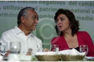 MERIDA, YUCATAN 12 FEBRERO2010.- La Gobernadora del estado Ivonne Ortega Pacheco junto con el dirigente nacional de la central obrera CROC, Isaías González Cuevas, durante la presentación del programa "Movimiento Nacional por un turismo verde". FOTO: HÉCTOR OSNAYA/CUARTOSCURO.COM